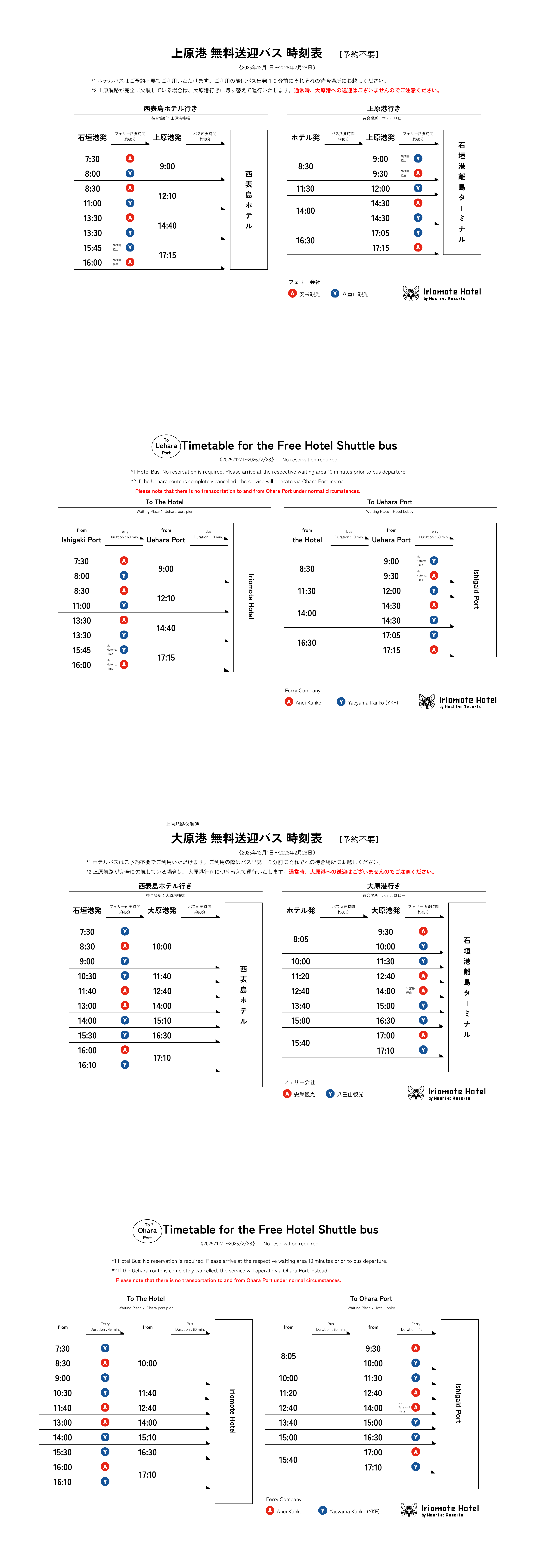 ・各港へのお迎え時は、お船の到着確認後に出発致します。お船の遅延や混雑時には定刻での運航とならない場合もございますので、予めご承知おきくださいませ。