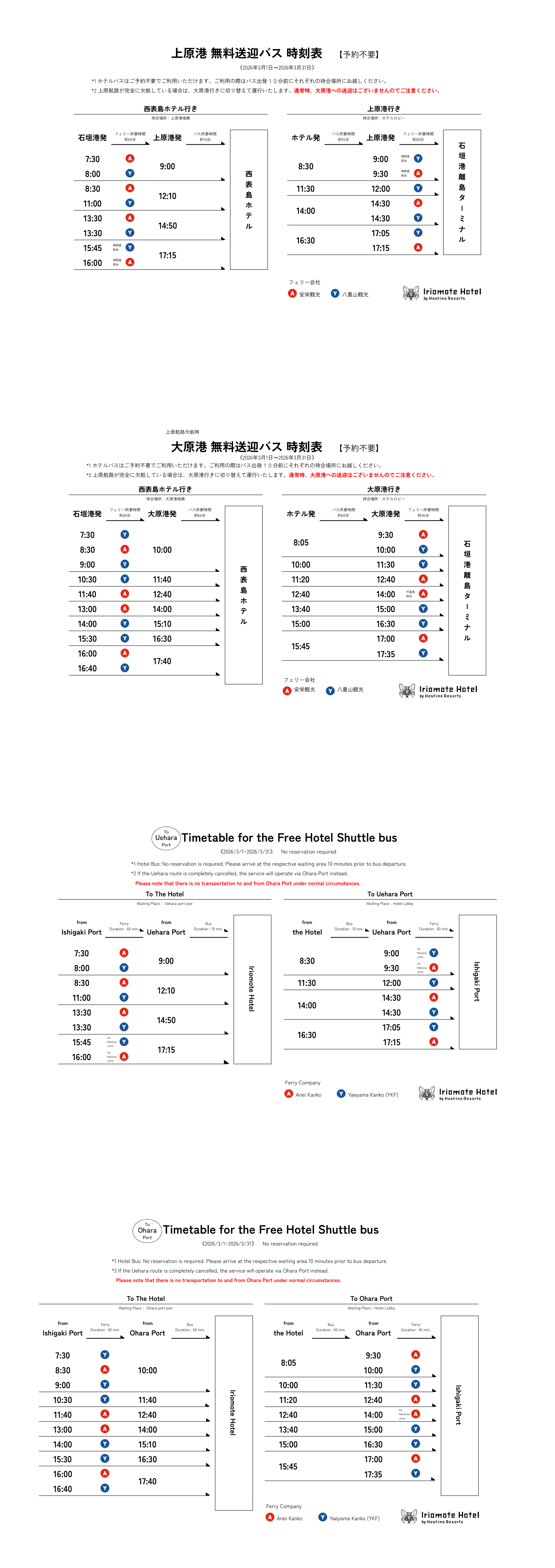 ・こちらのバスを利用するためには大原港までのバス送迎費として、石垣港⇔上原港間のチケットが必要です。石垣港⇔大原港の乗船券をすでにお持ちの場合には、バスの上原港出発時に上原港での差額料金支払いが必要になります。