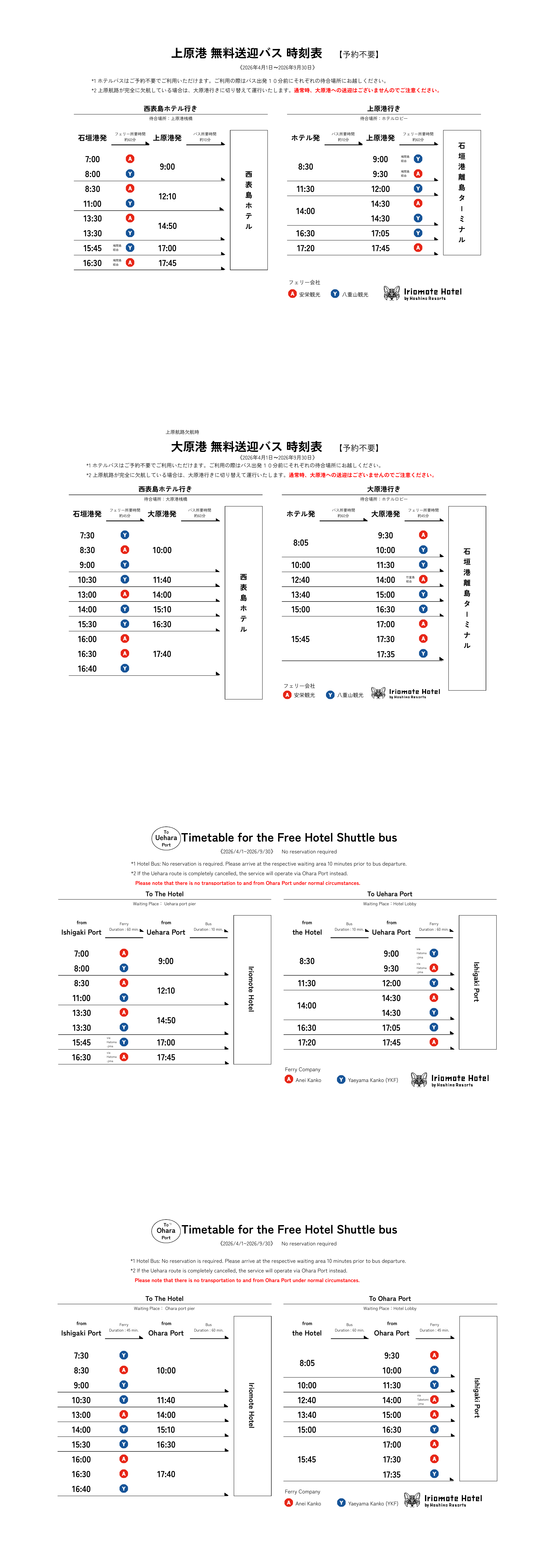 船会社様によって時刻が異なりますので、下記のリンクをご覧いただき、ホテルバスのお時間も併せてご確認くださいませ。